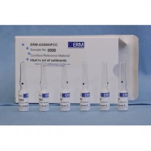 ERM-AD500/IFCC HbA1c 校準試劑盒由一組安瓿,包含約30μL的緩沖溶液(50 mmol/L 2-嗎啉乙醇磺酸(MES),10 mmol/L氰化.鉀,1 mmol/L 乙二胺四乙酸(EDTA),pH 6.2)的血紅蛋白。每個安瓿中含有約1毫克的血紅蛋白。