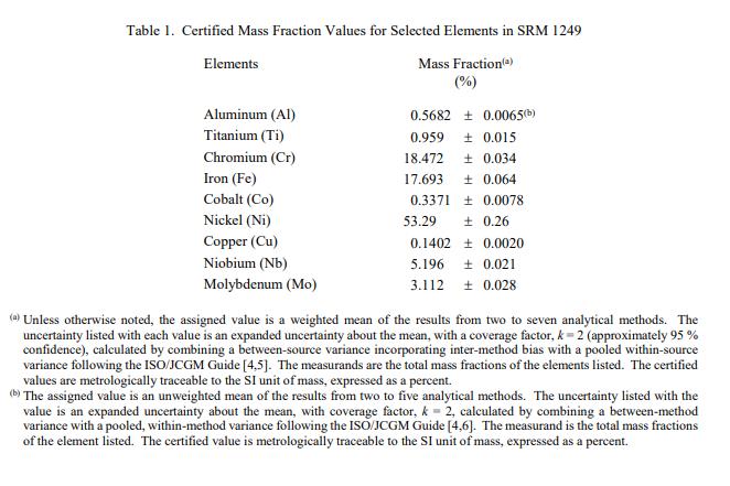 表 1 中提供了選定元素的認(rèn)證質(zhì)量分?jǐn)?shù)值。所有值均以質(zhì)量分?jǐn)?shù)報(bào)告 [1]。 NIST 認(rèn)證值是 NIST 對(duì)其準(zhǔn)確性有最高置信度的值,因?yàn)樗幸阎蚩梢傻钠顏?lái)源都已調(diào)查或考慮在內(nèi) [2]。一個(gè)認(rèn)證的值是根據(jù) NIST 和合作實(shí)驗(yàn)室使用表 4 中列出的測(cè)試方法進(jìn)行的分析結(jié)果對(duì)真實(shí)值的當(dāng)前最佳估計(jì)值。與值一起列出的不確定度是擴(kuò)展不確定度(95 % 置信度)[3],根據(jù)計(jì)算得出ISO/JCGM 指南 [4] 中的方法。