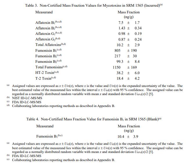 表 3 和表 4 中列出了 SRM 1565 中其他霉菌毒素的非認(rèn)證值。這些非認(rèn)證值是基于可用數(shù)據(jù)的最佳當(dāng)前估計(jì)值,但它們不符合 NIST 認(rèn)證標(biāo)準(zhǔn)。相關(guān)的不確定性可能不包括所有的偏差和可變性來(lái)源。這些值來(lái)自 NIST 和/或 FDA 使用既定方法 [1-3] 報(bào)告的結(jié)果,包括來(lái)自參與 NIST 進(jìn)行的實(shí)驗(yàn)室間研究的合作實(shí)驗(yàn)室 [4]。這些值可追溯到 NIST、FDA 和研究參與者使用的測(cè)量過(guò)程和標(biāo)準(zhǔn)。