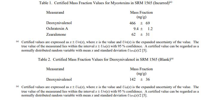 表 1 和表 2 分別提供了 SRM 1565(已發(fā)生)和 SRM 1565(空白)中脫氧雪腐鐮刀菌烯醇、赭曲霉毒素 A 和玉米赤霉烯酮的認(rèn)證質(zhì)量分?jǐn)?shù)值,按原樣報(bào)告。這些值是根據(jù) NIST 和美國(guó)食品藥品監(jiān)督管理局 (FDA) 使用既定方法 [1-3] 進(jìn)行的測(cè)量分配的,包括來(lái)自參與 NIST 進(jìn)行的實(shí)驗(yàn)室間研究的合作實(shí)驗(yàn)室的數(shù)據(jù) [4]。這些值可追溯到化學(xué)質(zhì)量分?jǐn)?shù)的 SI 測(cè)量單位,以納克/克表示。