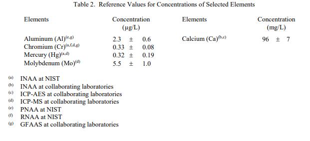 表 2 中提供了其他元素濃度的參考值。參考值是非認證值,是對真實值的最佳估計。但是,這些值不符合 NIST 認證標準,并且提供了相關的不確定性,這些不確定性可能僅反映測量精度,可能不包括所有不確定性來源,或者可能反映多種分析方法之間缺乏足夠的統計一致性 [2]。