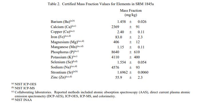 表 4 至 8 提供了 SRM 1845a 中其他分析物的參考質(zhì)量分?jǐn)?shù)值,按原樣報(bào)告。NIST 參考值是非認(rèn)證值,是基于真實(shí)值的最佳估計(jì)關(guān)于可用數(shù)據(jù);但是,該值不符合 NIST 標(biāo)準(zhǔn)認(rèn)證 [1] 并提供相關(guān)的不確定性,這些不確定性可能僅反映測(cè)量再現(xiàn)性,可能不包括所有不確定性來(lái)源,或者可能反映多種分析方法之間缺乏足夠的統(tǒng)計(jì)一致性。參考質(zhì)量分?jǐn)?shù)值來(lái)自 NIST 和/或合作實(shí)驗(yàn)室報(bào)告的結(jié)果。