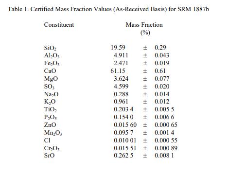 SRM 1887b 成分的認證值在表 1 中報告為收到時的質量分數 [1]。 NIST 認證值是 NIST 對其準確性具有最高置信度的值,因為所有已知或可疑的偏差來源都已被調查或考慮在內 [2]。一個認證值是根據 NIST 和合作實驗室使用附錄 A 中列出的儀器和經典測試方法進行的分析結果對真實值的當前最佳估計。