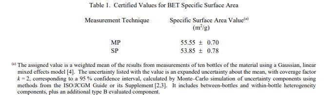 此 SRM 已通過可追溯至 ISO 9277:2010 的不連續(xù)測壓測量技術在液氮溫度 (77.3 K) 下通過氮氣吸附測定的 Brunauer-Emmet-Teller (BET) 比表面積認證。