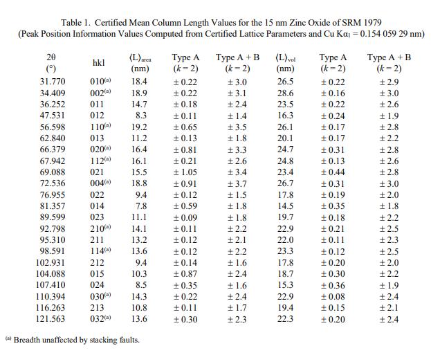 NIST 認(rèn)證值是 NIST 對其準(zhǔn)確性有最高置信度的值,因為所有已知或可疑的偏差來源都已被調(diào)查或考慮在內(nèi)。被測量是經(jīng)驗證的平均柱長,由 22 條衍射線的傅里葉分析確定,晶格參數(shù)為由 Pawley 分析確定。計量溯源性是國際單位制 (SI) 長度單位(以納米表示)。表 1 至表 4 中提供了認(rèn)證值和不確定度,并根據(jù) ISO/JCGM 指南 [3] 中描述的方法計算。