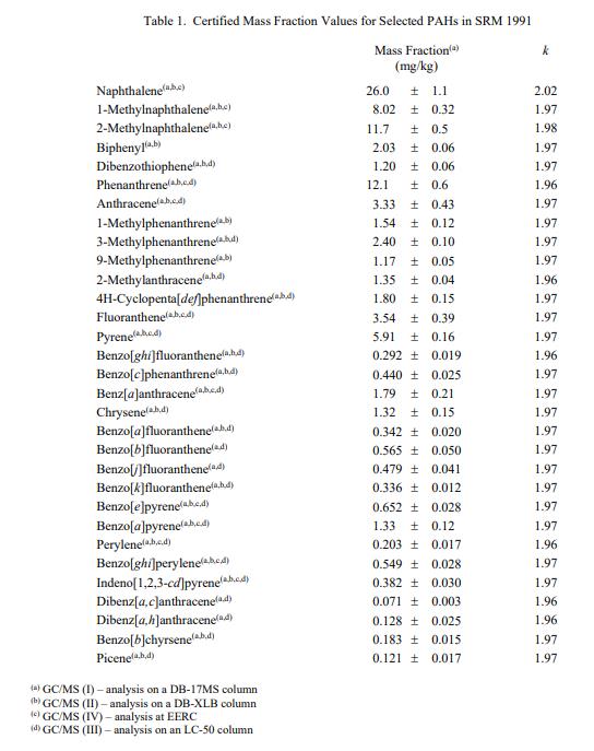 表 1 中提供了 PAH 的認(rèn)證質(zhì)量分?jǐn)?shù)值。 NIST 認(rèn)證值是 NIST 對(duì)其準(zhǔn)確性的最高置信度的值,因?yàn)樗幸阎蚩梢傻牟淮_定性來源都已調(diào)查或考慮在內(nèi)[2]。認(rèn)證值基于 NIST 和北達(dá)科他大學(xué)(北達(dá)科他州大福克斯)能源與環(huán)境研究中心 (EERC) 使用多種分析技術(shù)獲得的結(jié)果一致。