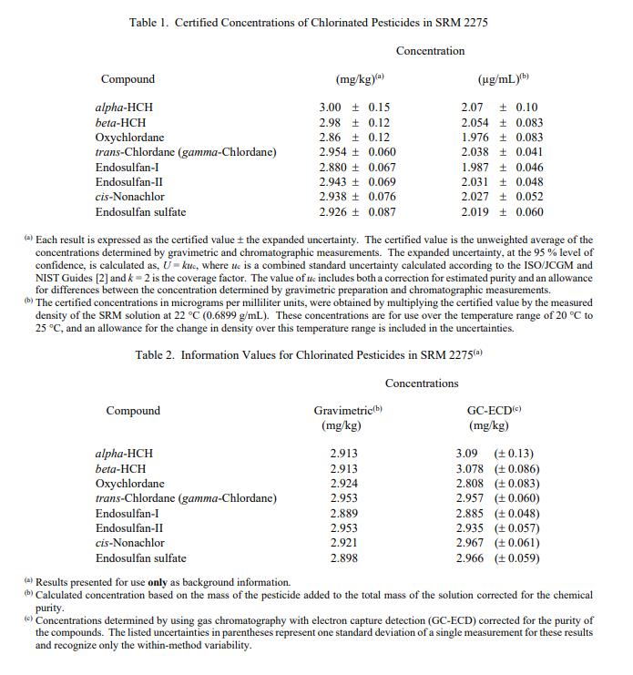表 1 給出了八種農藥的認證濃度值,以質量分數表示。這些值基于該溶液的重量法制備結果和使用氣相色譜法確定的分析結果。 NIST 認證值是 NIST 對其準確性的最高置信度,即所有已知或可疑來源的NIST [1] 已經調查或解釋了偏差。被測量列在表 1 中,認證值在計量上可追溯到 SI 派生的質量分數單位,以毫克/千克表示。