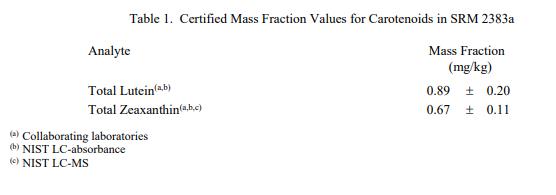 表 1 和表 2 中提供了 SRM 2383a 中類胡蘿卜素和元素的認證質量分數值,按原樣報告。NIST 認證值是 NIST 對其準確性有最高置信度的值因為所有已知或可疑的偏見來源都已被調查或考慮到[1]。價值分配分析由 NIST 和合作實驗室進行。