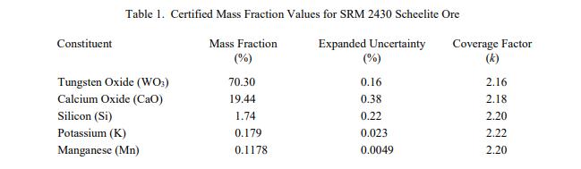 NIST SRM 2430白鎢礦(標準品)主要用于驗證分析含鎢礦石和其他類似基質材料的元素含量的化學和儀器方法。它可用于驗證內部參考資料的價值分配。 SRM 2430 的一個單元由一個裝有大約 100 克粉末的瓶子組成,這些粉末經過 150 目篩(< 0.1 毫米)研磨。