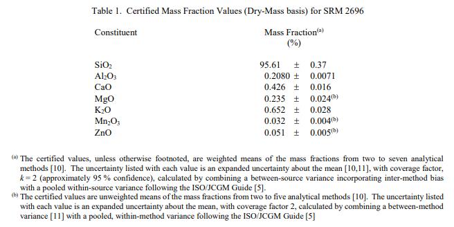 表 2 中列出了基于干質量 [3]、750 oC 燒失量和 SRM 2696 比表面積的成分參考值。參考值是代表最佳估計值的非認證值真實價值;但是,這些值不符合 NIST 的認證標準,并且提供了相關的不確定性,這些不確定性可能僅反映測量精度,可能不包括所有不確定性來源,或者可能反映多種分析方法之間缺乏足夠的統計一致性 [4]。