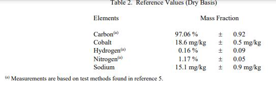 表 2 中提供了以干基質量分數(shù)表示的參考值。鈷和鈉的參考值基于單一 NIST 方法。碳、氫和氮的值基于 LECO 公司(密歇根州圣約瑟夫)執(zhí)行的單一方法,并得到實驗室質量服務國際代表 NIST 管理的實驗室間分析研究結果的證實。參考值是對真實值的最佳估計的非認證值;但是,這些值不符合 NIST 認證標準,并且提供了相關的不確定性,這些不確定性可能僅反映測量精度,可能不包括所有不確定性來源。
