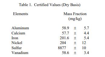 表 1 中提供了認證值,以干基的質量分數(shù) [1] 表示。NIST 認證值是 NIST 對其準確性有最高置信度的值,因為所有已知或可疑來源NIST 已經調查或解釋了偏差。鋁、鈣、鐵、鎳和釩的認證值基于兩種獨立的 NIST 方法。硫的認證值基于單一的 NIST 主要方法。