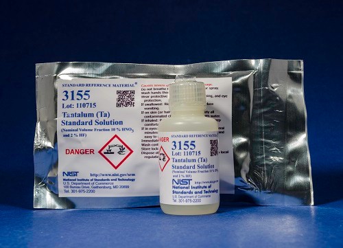 SRM 3150 - 硅標準溶液 標準品 旨在用作鈦定量測定的主要校準標準。 SRM 3162a 的一個單元由密封在鍍鋁袋中的高密度聚乙烯瓶中的 50 mL 水溶液組成。通過重量法制備溶液以包含已知質量分數的鈦。該溶液含有體積分數分別約為 10% 和 2% 的硝酸和氫氟酸,分別相當于約 1.6 mol/L 和 0.6 mol/L 的物質濃度(摩爾濃度)值。