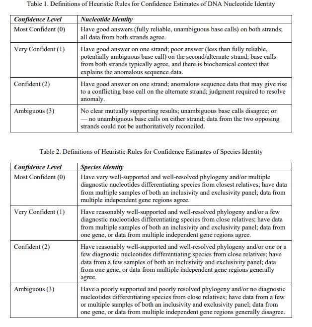經(jīng)認(rèn)證的物種鑒定是銀杏,來(lái)自 psbA-trnH 基因間間隔區(qū)和 trnL 內(nèi)含子區(qū)域的相關(guān)葉綠體 DNA 序列可在伴隨的 FASTA 格式文件中獲得 [1]。與序列中每個(gè)核苷酸相關(guān)的不確定性,以及與作為物種標(biāo)識(shí)符的 DNA 序列相關(guān)的不確定性,以表示對(duì)規(guī)定值的信念強(qiáng)度的序數(shù)尺度表示(0 = 最有信心,1 = 非常有信心,2 = 有信心,3 = 模棱兩可)(表 1 和表 2)[2]。