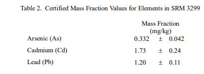 水分測定:SRM 3299 的水分含量在 NIST 通過 (1) 冷凍干燥 7 天至恒重進行測定; (2) 用高氯酸鎂在干燥器中室溫干燥28 d; (3)在80℃的強制通風烘箱中干燥2h。對所有三種技術的平均值進行平均,以確定每克接收質量的 (0.9146 ± 0.0060) 克干質量比例;此值上顯示的不確定性是擴展的不確定性,代表 95 % 的置信水平。用于將數據從原樣轉換為干質量基礎的轉換因子是干質量比例的倒數,即原樣數據除以 0.9146 以確定干質量結果。從水分測量中獲得的轉換因子的相對不確定度為 0.3%,并包含在本證書中提供的認證值的不確定度中,以干重為基礎報告。