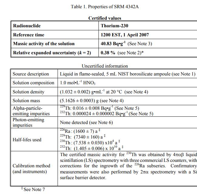 標準參考物質 NIST SRM 4342A - 釷-230放射性標準