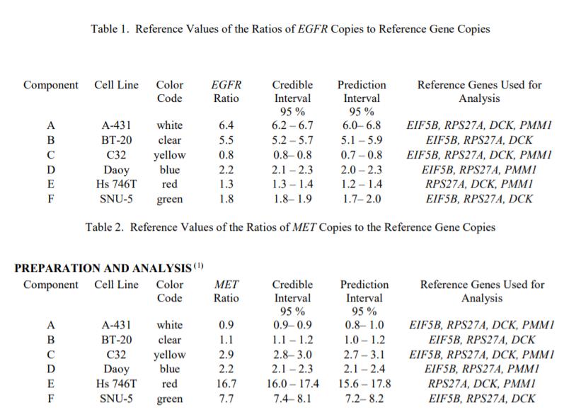在 260 nm 處通過吸光度測量確定的組分 A、B、C、D、E 和 F 的濃度分別為 21.6 μg/mL、21.7 μg/mL、21.5 μg/mL、22.9 μg/mL、23.1 μg/mL 和 21.0微克/毫升,分別。在準備稀釋液時,重要的是要考慮各個組分中 EGFR 和 MET 的擴增水平,以確保 EGFR 和 MET 拷貝數(shù)在您正在使用的檢測的工作范圍內。一個單位的 RM 由每個組分的一個小瓶組成,其中包含大約 100 μL 的 DNA 溶液。這些小瓶中的每一個都貼有標簽,并且用顏色編碼的螺帽密封。